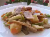 Ingredientes: Filetes de lomo muy finos 1 Cebolla grande partida en pedacitos pequeños 1/2 kg. de judías verdes 3 Zanahorias partidas a bastoncillos muy finos...