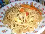 Ingredientes: 1 pechuga de pollo 1/2 cebolla 1 bote brotes de bambu 2 puñados de fideos chinos 1 puñado de almendras Salsa de soja Harina Aceite de sesamo 1...