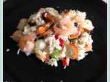 Ingredientes: 1 paquete de salpicón de marisco preparado (yo lo he comprado en Mercadona) Arroz basmati (2 puñados por persona) 2 hojas de laurel Eneldo Aceite...