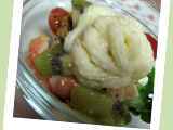 Ingredientes: 4 kiwis 15 langostinos 200 g de queso fresco 8 tomates cherry lechugas variadas mayonesa de manzana aceite de oliva, una pizca de sal y perejil