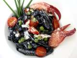 Ingredientes: 500 g de pasta de tinta de calamar 2 bogavantes 2 tazas de crema 150 g de tomates cherry 1 / 2 taza de guisantes verdes 2 chalotas 1 copa de...