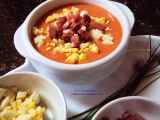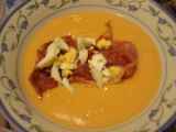 Ingredientes: Para el salmorejo: 1 kg de tomates 1 diente de ajo sal 150 gr miga de pan 100 ml aceite de oliva Para decorar: 2 huevos duros jamón serrano