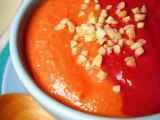 Ingredientes: 3 remolachas cocidas (envasadas en bolsa) 1 tomate grande muy maduro 1/2 pimiento verde 1/2 pimiento rojo Un poco de pan del día anterior 2...