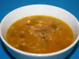 Ingredientes: 100 g de Trigo 2 muslos de Pollo 1 Puerro 1 Zanahoria 1 Pimiento Verde 2 dientes de Ajo 1 Hueso de jamón 2 lonchas de Jamón Agua Aceite de Oliva...