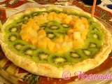 Ingredientes: Una plancha de masa de hojaldre. 1 kiwi. 1 plátano. Fresas en almíbar. Crema pastelera: 500 mililitros de leche. 200 gramos de azúcar. 60 gramos de...
