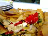 Ingredientes: 400 g de harina de fuerza 6 g de sal 330 ml de agua (sobre 50°) 30 ml de aceite de oliva Maizena para estirar la masa Relleno para dos personas: 6...