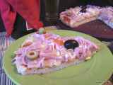 Ingredientes: 1 masa de hojaldre 1 paquete de bacon en taquitos. Unos pocos champiñones. 1/2 calabacín (no tenía más...) 1 lata de pimientos cortados a tiras....