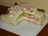Ingredientes: Pan Bimbo (Rebanadas Grandes). Atún en escabeche. Rodajas de Tomate. Hojas de Lechuga. Huevo Duro. Palitos de Cangrejo. (Para decorar) Pepinillos....
